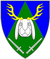 ![]() Per chevron throughout azure and vert, a coney's head cabossed argent attired Or, in base two swords in chevron inverted argent. |